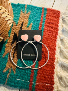 Navajo Queen Pink Conch & Sterling Silver Heart Dangle Hoop Earrings